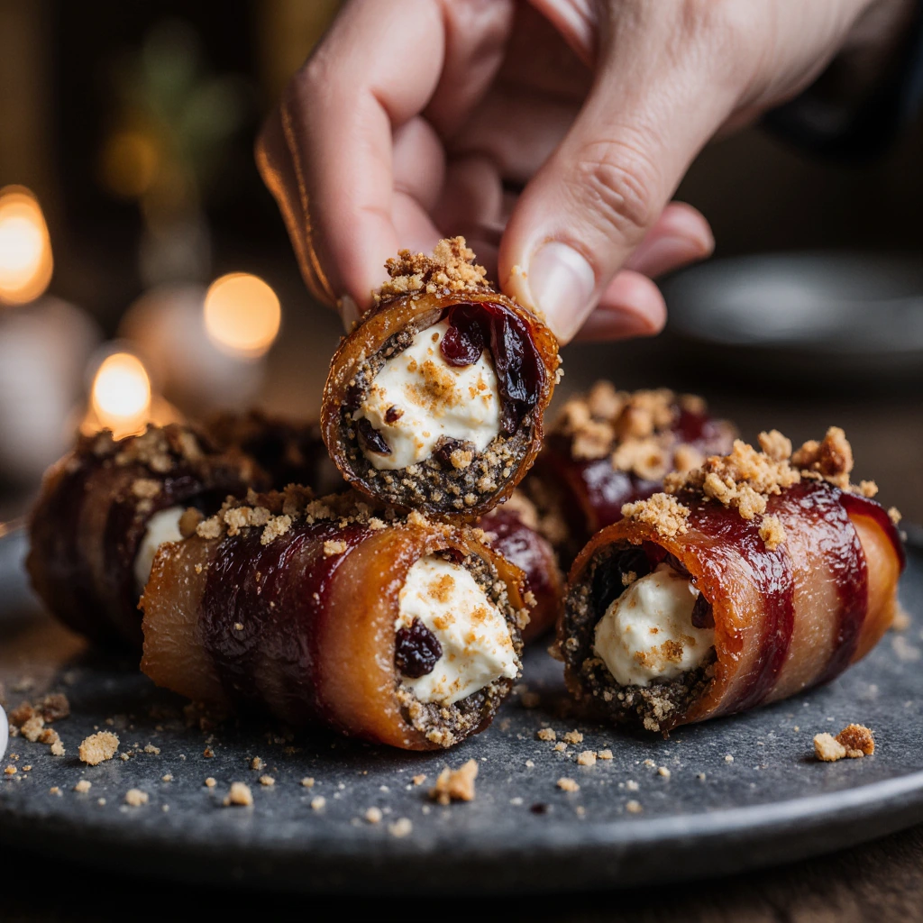 - Wickeln Sie die Datteln ein: Umwickeln Sie jede gefüllte Dattel straff mit einer Scheibe Rinderspeck.
