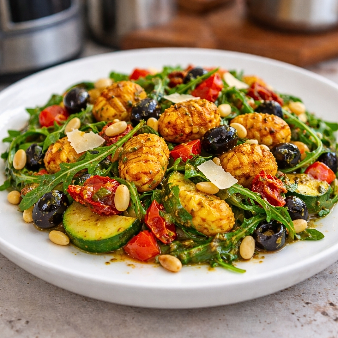 - Gnocchi hinzufügen: Füge die knusprigen Gnocchi zum Salat hinzu und vermenge alles gut.